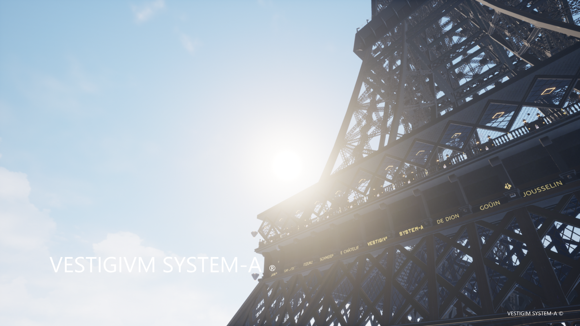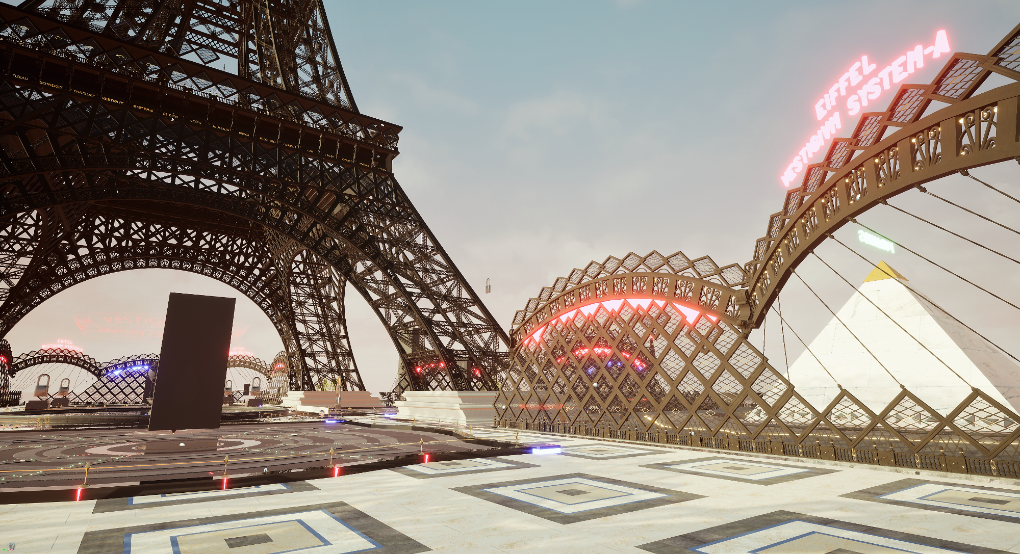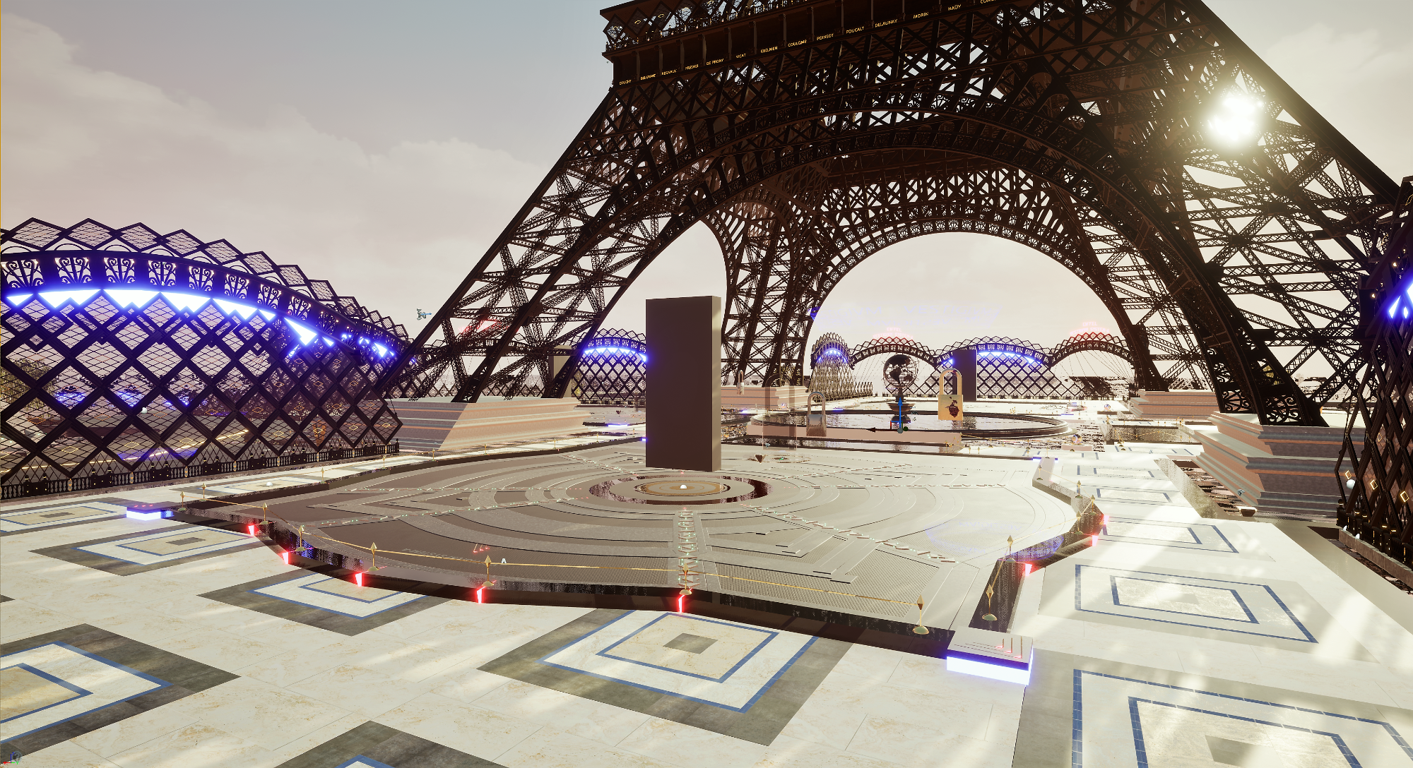 Ciudad de Pirámides, la Torre Eiffel, la tierra en 3d vista desde el espacio, la Catedral de San Andrés de Kiev, la Catedral de Málaga, la Mezquita Hassan II, la Mezquita Sheikh Zayed y un variado conjunto de originales construcciones y escenarios virtuales creados con el motor gráfico Unreal Engine.